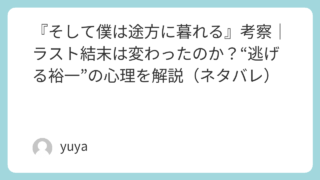 『そして僕は途方に暮れる』考察|ラスト結末は変わったのか?“逃げる裕一”の心理を解説(ネタバレ) 映画『そして僕は途方に暮れる』は、事件も陰謀も起きません。起きるのは、**「気まずい」「怒られる」「向き合うのが怖い」**みたいな、日常の延長線にあるしんどさだけ。それなのに、主人公・裕一は話し合いを選ばず、ひたすら逃げて、逃げて、逃げ続け... 2026.01.13 Uncategorized
