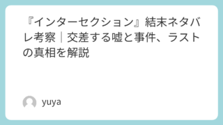 『インターセクション』結末ネタバレ考察|交差する嘘と事件、ラストの真相を解説 映画好き向けに「インター セクション 映画 考察」で検索してきた人が知りたいのは、だいたいこの3つです。そもそもどんな映画?(あらすじ・登場人物)ラストはどうなる?(ネタバレ結末)“交差(Intersections)”って何が交差してたの?... 2026.01.14 Uncategorized