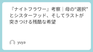 『ナイトフラワー』考察|母の“選択”とシスターフッド、そしてラストが突きつける残酷な希望 映画『ナイトフラワー』は、「大切なものを守るためなら、人はどこまで踏み越えられるのか」という問いを、観る側の胸にねじ込んでくる作品です。正しさでは救えない夜の世界で、主人公が選ぶのは“きれいな答え”ではなく、生き延びるための現実。そこに、も... 2026.01.26 Uncategorized