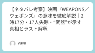 【ネタバレ考察】映画『WEAPONS/ウェポンズ』の意味を徹底解説|2時17分・17人失踪・“武器”が示す真相とラスト解釈 深夜2時17分、同じクラスの子どもたち17人が一斉に家を出て、そのまま消えた——。『WEAPONS/ウェポンズ』は、ただの“失踪ミステリー”でも、ただの“ホラー”でもありません。事件の謎を追うほどに、町の空気は濁り、噂や疑いが人を追い詰め、... 2026.01.28 Uncategorized