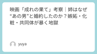 映画「成れの果て」考察|姉はなぜ“あの男”と婚約したのか?嫉妬・化粧・共同体が暴く地獄 姉から届いた「婚約したよ」という連絡――その相手の名前を聞いた瞬間、妹は固まります。8年前、自分の人生を壊した出来事に関わる男。その“加害の記憶”がまだ身体に残るのに、彼は地元で普通の人生を手に入れようとしている。映画「成れの果て」は、この... 2026.02.03 Uncategorized