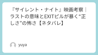 『サイレント・ナイト』映画考察|ラストの意味とEXITピルが暴く“正しさ”の怖さ【ネタバレ】 「サイレント ナイト 映画 考察」でたどり着いた方へ。『サイレント・ナイト』は、クリスマス映画のような温かさと、終末映画の冷たさを同時に突きつける異色作です。笑いのある食卓、気心の知れた友人たち、そして“最後の夜”を前にした静かな違和感——... 2026.02.14 Uncategorized