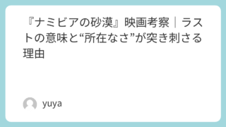 『ナミビアの砂漠』映画考察|ラストの意味と“所在なさ”が突き刺さる理由 『ナミビアの砂漠』は、ただの恋愛映画でも、若者の自意識ドラマでもありません。主人公カナの揺れ続ける感情、ホンダとハヤシの対比、そして言葉より先に噴き出す身体の衝動――そのすべてが、2020年代を生きる私たちの「生きづらさ」を映し出しています... 2026.02.14 Uncategorized