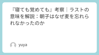 『寝ても覚めても』考察|ラストの意味を解説:朝子はなぜ麦を忘れられなかったのか 濱口竜介監督の映画『寝ても覚めても』は、観終わったあとに「これは純愛なのか、それとも執着なのか」と考え込んでしまう作品です。同じ顔をした“麦”と“亮平”のあいだで揺れる朝子の選択は、単なる三角関係では片づけられません。本記事では、『寝ても覚... 2026.02.14 Uncategorized