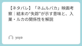 【ネタバレ】「ネムルバカ」映画考察|結末の“失踪”が示す意味と、入巣・ルカの関係性を解説 「ネムルバカ」は、ゆるい大学生活を描いた青春映画——そう思って観始めると、ラストで静かに胸をえぐられます。なぜ先輩は“失踪”という形を選んだのか。入巣とルカの関係は友情だったのか、それとも別の感情だったのか。そして、主題歌「ネムルバカ」が物... 2026.02.14 Uncategorized
