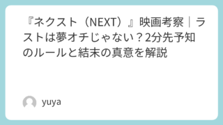 『ネクスト(NEXT)』映画考察|ラストは夢オチじゃない?2分先予知のルールと結末の真意を解説 「結局あのラスト、どういう意味だったの?」——映画『NEXT -ネクスト-』を観たあと、多くの人がここで引っかかります。本記事では、クリスの“2分先予知”のルール、リズだけが例外になる理由、終盤の時間構造、そして原作『ゴールデン・マン』との... 2026.02.14 Uncategorized