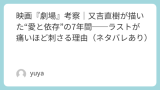 映画『劇場』考察|又吉直樹が描いた“愛と依存”の7年間──ラストが痛いほど刺さる理由(ネタバレあり) 恋愛映画なのに、観終わったあと胸の奥がずっとざらつく。行定勲監督×原作・又吉直樹の映画『劇場』は、「夢を追う男」と「支え続ける女」の7年間を、ロマンチックに飾らず、痛いほどリアルに切り取った作品です。売れない劇作家・永田の未熟さは、ときに腹... 2026.03.03 Uncategorized