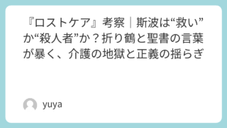 『ロストケア』考察|斯波は“救い”か“殺人者”か?折り鶴と聖書の言葉が暴く、介護の地獄と正義の揺らぎ 在宅介護の現場で起きた“連続死”事件。映画『ロストケア』は、犯人探しのスリルよりも先に、「なぜ彼は殺したのか」という問いを観客の胸に突き刺してきます。介護士・斯波宗典は42人を手にかけたとされながらも、自分の行為を「救い」だと言い切る。一方... 2026.03.03 Uncategorized