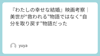 『わたしの幸せな結婚』映画考察|美世が“救われる”物語ではなく“自分を取り戻す”物語だった “政略結婚から始まる恋”と聞くと、甘いラブストーリーを想像するかもしれません。でも映画『わたしの幸せな結婚』が本当に胸を打つのは、恋のときめきよりも——長い間否定され続けた少女・美世が、安心できる居場所の中で少しずつ「自分の感情」を取り戻し... 2026.03.03 Uncategorized
