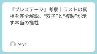 『プレステージ』考察|ラストの真相を完全解説。“双子”と“複製”が示す本当の犠牲 映画『プレステージ』は、奇術師同士の復讐劇に見せかけて、実は“観客の視線”そのものを騙しにくる作品です。「瞬間移動の種は?」「ボーデンの正体は?」「テスラの装置は本物?」――観ている間ずっと謎を追いかけさせられるのに、ラストで明かされる真相... 2026.03.03 Uncategorized