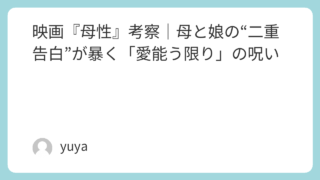 映画『母性』考察|母と娘の“二重告白”が暴く「愛能う限り」の呪い 映画『母性』は、女子高生の転落死をきっかけに“母と娘それぞれの告白”で過去を辿っていくサスペンスです。ところが、同じ出来事を語っているはずなのに、記憶の細部も感情の温度も噛み合わない。母は「愛していた」と言い、娘は「愛されなかった」と言う—... 2026.03.03 Uncategorized