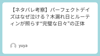 【ネタバレ考察】パーフェクトデイズはなぜ泣ける?木漏れ日とルーティンが照らす“完璧な日々”の正体 毎日ほとんど同じ時間に起き、同じ道を通り、同じ仕事を丁寧にこなす——映画『PERFECT DAYS(パーフェクトデイズ)』は、そんな“淡々とした日常”だけで観客の心を揺らしてきます。派手な展開はないのに、ふと差し込む木漏れ日や、短い会話、カ... 2026.03.03 Uncategorized