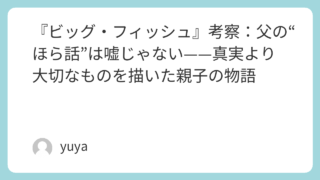 『ビッグ・フィッシュ』考察:父の“ほら話”は嘘じゃない——真実より大切なものを描いた親子の物語 もし、あなたの父が“ほら話”ばかりする人だったら。笑って聞き流せる日もある。でも、肝心なことを何ひとつ話してくれない気がして、だんだん腹が立ってくる——『ビッグ・フィッシュ』は、そんな「親子の距離」を、ファンタジックな物語の形で描き切った作... 2026.03.03 Uncategorized