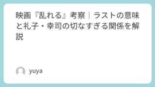 映画『乱れる』考察|ラストの意味と礼子・幸司の切なすぎる関係を解説 映画『乱れる』は、成瀬巳喜男監督による名作ドラマであり、義姉と義弟の許されない感情を軸にしながら、家族、時代の変化、そして“自分の人生を生きることの難しさ”を静かに描いた作品です。一見すると悲恋映画のように見えますが、本作の本当の魅力は、礼... 2026.03.24 Uncategorized