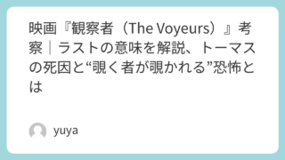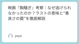 映画『胸騒ぎ』考察|なぜ逃げられなかったのか?ラストの意味と“善良さの罠”を徹底解説 映画『胸騒ぎ』は、派手な演出や露骨な恐怖描写に頼らず、じわじわと観る者の不安を煽っていく異色の心理ホラーです。旅先で出会った一家との交流から始まる物語は、どこにでもありそうな“ちょっとした違和感”の積み重ねによって、やがて取り返しのつかない... 2026.03.24 Uncategorized