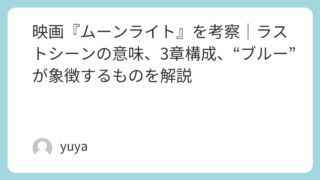映画『ムーンライト』を考察|ラストシーンの意味、3章構成、“ブルー”が象徴するものを解説 映画『ムーンライト』は、黒人の少年シャロンの成長を3つの時代に分けて描いた、静かでありながら非常に強い余韻を残す作品です。派手な展開があるわけではないのに、観終わったあと「ラストはどういう意味だったのか」「なぜあれほど胸に残るのか」と考えず... 2026.03.24 Uncategorized