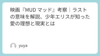 映画『MUD マッド』考察|ラストの意味を解説、少年エリスが知った愛の理想と現実とは 映画『MUD マッド』は、逃亡者マッドと2人の少年の出会いを描いた作品でありながら、実際には“少年が大人の世界を知っていく瞬間”を繊細に映し出した成長物語です。ミシシッピ川の雄大な風景のなかで描かれるのは、恋愛への憧れ、家族の揺らぎ、そして... 2026.03.24 Uncategorized