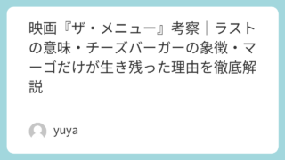 映画『ザ・メニュー』考察|ラストの意味・チーズバーガーの象徴・マーゴだけが生き残った理由を徹底解説 高級レストランを舞台にした異色のサスペンス映画『ザ・メニュー』。本作は、一見すると“美食ホラー”のようでありながら、その実態は階級社会・消費文化・創作者と観客の関係を鋭くえぐる社会風刺に満ちた作品です。とくに話題になったのが、衝撃的なラスト... 2026.03.24 Uncategorized