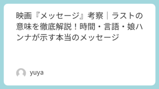 映画『メッセージ』考察|ラストの意味を徹底解説!時間・言語・娘ハンナが示す本当のメッセージ 映画『メッセージ』は、異星人とのファーストコンタクトを描いたSF作品でありながら、単なる宇宙人映画では終わらない深いテーマ性を持った名作です。特に印象的なのが、ラストで明かされる時間の仕掛けと、主人公ルイーズが下した切ない選択ではないでしょ... 2026.03.24 Uncategorized