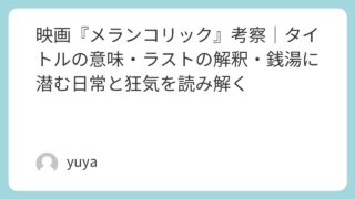 映画『メランコリック』考察|タイトルの意味・ラストの解釈・銭湯に潜む日常と狂気を読み解く 映画『メランコリック』は、一見すると地味で静かな青春映画のようでありながら、その実、日常と暴力、ユーモアと不穏さが絶妙に同居した異色の一作です。銭湯という親しみのある空間を舞台にしながら、主人公・鍋岡和彦が“裏の仕事”に足を踏み入れていく展... 2026.03.24 Uncategorized