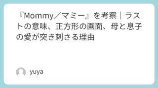 『Mommy/マミー』を考察|ラストの意味、正方形の画面、母と息子の愛が突き刺さる理由 グザヴィエ・ドラン監督の映画『Mommy/マミー』は、観終わったあとに強い余韻を残す作品です。シングルマザーのダイアンと、衝動性の激しい息子スティーヴの関係は、単なる“親子の愛”では言い表せないほど複雑で、痛々しく、それでいてどうしようもな... 2026.03.24 Uncategorized