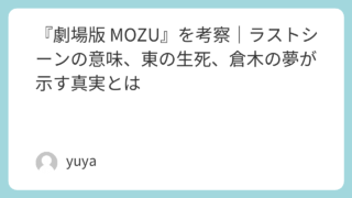 『劇場版 MOZU』を考察|ラストシーンの意味、東の生死、倉木の夢が示す真実とは 『劇場版 MOZU』は、壮大な陰謀、圧倒的な暴力描写、そして現実と幻想が交錯する独特の世界観によって、多くの視聴者に強烈な印象を残した作品です。しかしその一方で、ラストシーンの意味や東の生死、倉木が見ていた“夢”の解釈など、明確に説明されな... 2026.03.24 Uncategorized