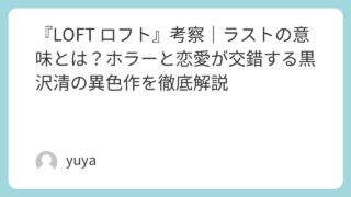 『LOFT ロフト』考察|ラストの意味とは?ホラーと恋愛が交錯する黒沢清の異色作を徹底解説 映画『LOFT ロフト』は、黒沢清監督らしい不穏な空気に満ちた作品でありながら、単なるホラー映画では片づけられない奥深さを持った一作です。ミイラ、幽霊、閉ざされた空間、そして“永遠の愛”という不気味なモチーフが重なり合い、観る者に強烈な違和... 2026.04.01 Uncategorized