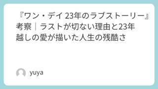 『ワン・デイ 23年のラブストーリー』考察|ラストが切ない理由と23年越しの愛が描いた人生の残酷さ 『ワン・デイ 23年のラブストーリー』は、ただの恋愛映画ではありません。大学卒業の日に出会ったエマとデクスターの23年にわたる関係を、“毎年7月15日”だけで描くこの作品は、恋のときめき以上に、人生のすれ違いやタイミングの残酷さを静かに突き... 2026.04.01 Uncategorized