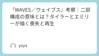 『WAVES/ウェイブス』考察|二部構成の意味とは?タイラーとエミリーが描く喪失と再生 映画『WAVES/ウェイブス』は、ただの青春映画でも家族ドラマでもありません。前半では兄タイラーの転落、後半では妹エミリーの再生を描くことで、ひとつの悲劇が家族全体にどのような“波”を広げていくのかを繊細に映し出した作品です。本作には、父親... 2026.04.01 Uncategorized