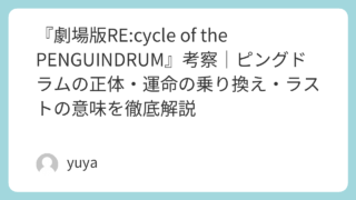 『劇場版RE:cycle of the PENGUINDRUM』考察|ピングドラムの正体・運命の乗り換え・ラストの意味を徹底解説 『劇場版RE:cycle of the PENGUINDRUM』は、TVアニメ『輪るピングドラム』を再構築しながら、あらためて“運命”“家族”“愛”“自己犠牲”というテーマを浮かび上がらせた作品です。一見すると難解に見える物語ですが、ピング... 2026.04.01 Uncategorized
