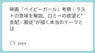 映画『ベイビーガール』考察|ラストの意味を解説、ロミーの欲望と“支配/服従”が描く本当のテーマとは 映画『ベイビーガール』は、一見すると“危険な情事”を描いたエロティックスリラーのように見えます。ですが実際には、主人公ロミーが自分の中に押し込めてきた欲望や羞恥、そして本当の自分と向き合っていく、非常に現代的なテーマを持った作品です。特に本... 2026.04.01 Uncategorized