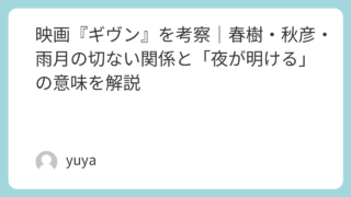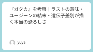 『ガタカ』を考察|ラストの意味・ユージーンの結末・遺伝子差別が描く本当の恐ろしさ 映画『ガタカ』は、遺伝子によって人間の価値が決められる近未来を描いたSF映画です。しかし本作の魅力は、単なるディストピア作品にとどまらないところにあります。物語の中心にあるのは、「人は生まれで決まるのか」「努力や意志は運命を超えられるのか」... 2026.04.01 Uncategorized