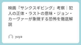 映画『サンクスギビング』考察|犯人の正体・ラストの意味・ジョン・カーヴァーが象徴する恐怖を徹底解説 2023年公開のホラー映画『サンクスギビング』は、血みどろのスラッシャー作品でありながら、単なる残酷映画では終わらない奥行きを持った一本です。ブラックフライデーの暴動をきっかけに始まる連続殺人は、犯人探しのサスペンスとしても楽しめる一方で、... 2026.04.01 Uncategorized