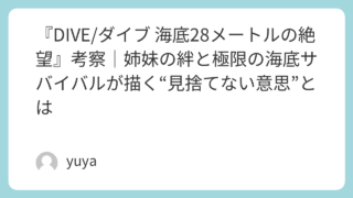 『DIVE/ダイブ 海底28メートルの絶望』考察|姉妹の絆と極限の海底サバイバルが描く“見捨てない意思”とは 映画『DIVE/ダイブ 海底28メートルの絶望』は、海底28メートルに閉じ込められた姉と、救出に挑む妹の姿を描いたサバイバルスリラーです。極限状態の恐怖を描くだけでなく、本作では姉妹の関係性や、命のリミットが迫るなかで試される人間の意志も大... 2026.04.09 Uncategorized