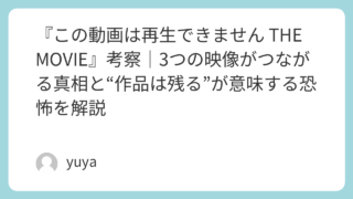 『この動画は再生できません THE MOVIE』考察|3つの映像がつながる真相と“作品は残る”が意味する恐怖を解説 映画『この動画は再生できません THE MOVIE』は、ホラーの不気味さをまといながら、実際には緻密な伏線と推理で見せる異色のミステリー作品です。バラバラに見えた映像が少しずつつながり、やがて一つの事件と人間の執着が浮かび上がってくる構成は... 2026.04.09 Uncategorized