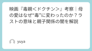 映画『毒親<ドクチン>』考察|母の愛はなぜ“毒”に変わったのか?ラストの意味と親子関係の闇を解説 映画『毒親<ドクチン>』は、娘を思う母の愛情が、いつしか支配と抑圧へと変質していく過程を描いた衝撃作です。表向きには“娘のため”に見える言動の数々が、実は少女の心を静かに追い詰めていく――本作はそんな家庭内の見えない暴力を、ミステリーの緊張... 2026.04.09 Uncategorized