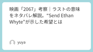 映画「2067」考察|ラストの意味をネタバレ解説。“Send Ethan Whyte”が示した希望とは 映画「2067」は、荒廃した未来世界とタイムトラベルの謎を組み合わせたSFスリラーでありながら、物語の核には“希望を未来へつなぐ意志”が描かれた作品です。作中では、「Send Ethan Whyte」という謎のメッセージ、自分自身の死体、父... 2026.04.14 Uncategorized
