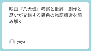 映画『八犬伝』考察と批評|創作と歴史が交錯する異色の物語構造を読み解く 2024年に公開された映画『八犬伝』は、滝沢馬琴の未完の物語をベースに、フィクションと実在の作家・画家を交えた独自の世界観を打ち出しました。壮大な歴史ファンタジーとしての側面と、創作という行為そのものをめぐるメタ的な視点が共存する本作は、賛... 2025.09.30 Uncategorized