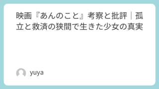 映画『あんのこと』考察と批評|孤立と救済の狭間で生きた少女の真実 2023年公開の邦画『あんのこと』は、ひとりの少女の短くも過酷な人生を通して、現代日本の社会問題と人間の救済を描いた重厚な作品です。観客の心を強く揺さぶるこの作品は、単なる実話の再現に留まらず、多層的なテーマや象徴的な演出によって深い余韻を... 2025.09.30 Uncategorized