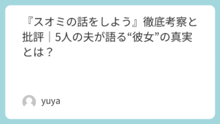 『スオミの話をしよう』徹底考察と批評|5人の夫が語る“彼女”の真実とは? 2024年に公開された三谷幸喜監督の映画『スオミの話をしよう』は、独特の構成と会話劇の妙によって、観客の間で大きな話題となりました。本作は、1人の女性「スオミ」を5人の元夫たちが語り合うという形式で物語が進みますが、その中にある真実や嘘、沈... 2025.09.30 Uncategorized