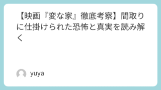 【映画『変な家』徹底考察】間取りに仕掛けられた恐怖と真実を読み解く 近年、YouTube発の人気コンテンツが映画化される事例が増える中で、特に異彩を放ったのが『変な家』です。原作はYouTuber「雨穴」氏が発表した動画と書籍。平凡な一軒家に潜む「変な間取り」の謎が話題となり、多くの読者を戦慄させました。2... 2025.09.30 Uncategorized