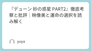 『デューン 砂の惑星 PART2』徹底考察と批評|映像美と運命の選択を読み解く フランク・ハーバート原作の壮大なSF叙事詩を映画化した『デューン 砂の惑星 PART2』は、前作で撒かれた謎と伏線を回収しながら、壮麗な映像美と深いテーマ性で観客を圧倒します。本記事では、「考察」と「批評」という視点から、この映画が描こうと... 2025.09.30 Uncategorized