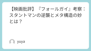 【映画批評】『フォールガイ』考察:スタントマンの逆襲とメタ構造の妙とは? 映画『フォールガイ』は、ただのアクション・コメディに留まらず、“スタントマン”という映画制作の裏側にスポットを当てたメタ的な作品です。監督デヴィッド・リーチ自身が元スタントマンという経歴を持ち、映画全体を通して「裏方の英雄」に敬意を込めた描... 2025.09.30 Uncategorized