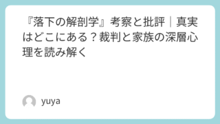 『落下の解剖学』考察と批評|真実はどこにある?裁判と家族の深層心理を読み解く ジャンヌ・ユスタシュ監督による『落下の解剖学(Anatomie d’une chute)』は、2023年のカンヌ国際映画祭でパルム・ドールを受賞した注目作です。その題名通り、物理的な「落下」だけではなく、家庭の崩壊、信頼の喪失、そして人間関... 2025.09.30 Uncategorized
