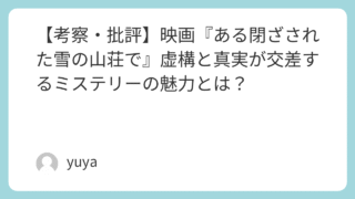 【考察・批評】映画『ある閉ざされた雪の山荘で』虚構と真実が交差するミステリーの魅力とは? 2024年公開の映画『ある閉ざされた雪の山荘で』は、東野圭吾原作の同名小説を基にした密室サスペンスです。演劇オーディションのために集められた7人の俳優たちが、雪に閉ざされた山荘で奇妙な「芝居」を演じながら、やがて一人また一人と姿を消していく... 2025.09.30 Uncategorized