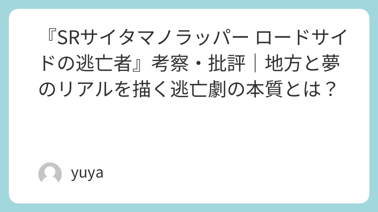『SRサイタマノラッパー ロードサイドの逃亡者』は、「夢を追うとは何か?」「逃げることは本当に悪なのか?」という普遍的なテーマを、ラップと地方という文脈で鋭く描いた作品です。
