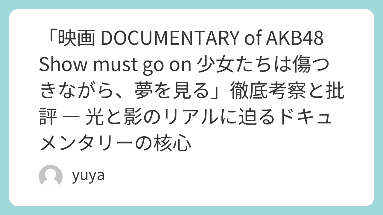 『DOCUMENTARY of AKB48 Show must go on 少女たちは傷つきながら、夢を見る』は、華やかなステージの背後にあるリアルな感情、葛藤、成長、そして苦悩を赤裸々に映し出した作品です。