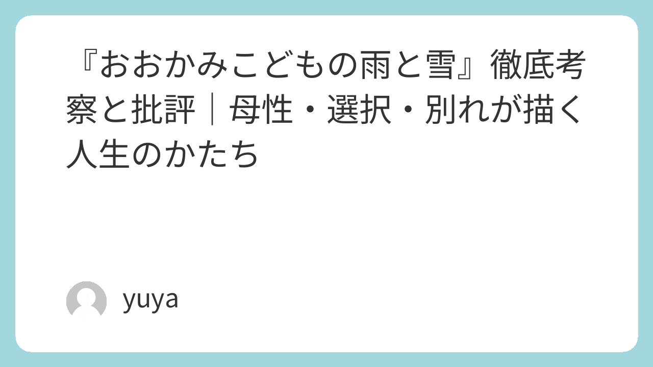 『おおかみこどもの雨と雪』は、親と子、個と社会、自然と人間といった多層的なテーマを内包した作品です。その中で私たちは、「選ぶこと」「手放すこと」「信じること」の大切さを静かに学ぶことができます。