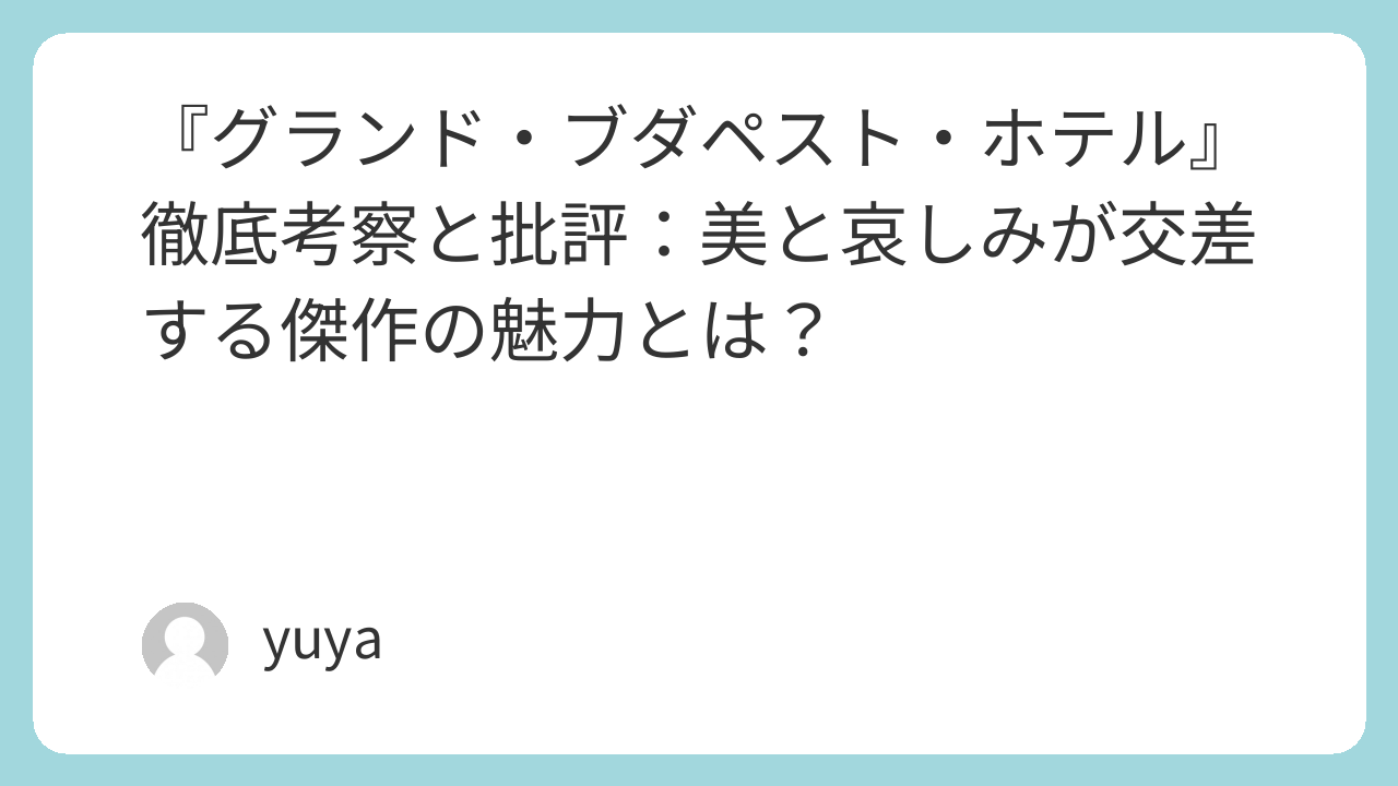 『グランド・ブダペスト・ホテル』は、形式美に隠された人間の哀しみと、失われた時代へのノスタルジーを詩的に描いた傑作。単なるおしゃれ映画として終わらせず、歴史や人生への眼差しを持って観ることで、より深い味わいが生まれる作品です。