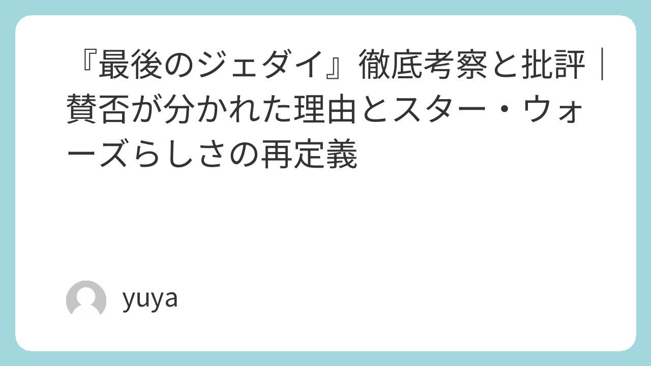 『最後のジェダイ』は、従来の価値観を根本から揺さぶる挑戦的な一作であり、それゆえに多くの議論を生んだ。これは「スター・ウォーズらしさとは何か?」を問い直す転機となった作品である。